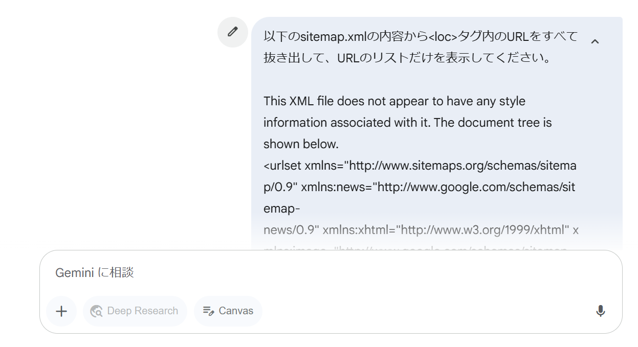 以下のsitemap.xmlの内容から<loc>タグ内のURLをすべて抜き出して、URLのリストだけを表示してください。 [ここにコピーしたsitemap.xmlの内容を貼り付け]プロンプト入力時: