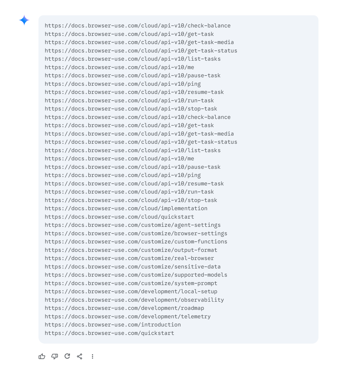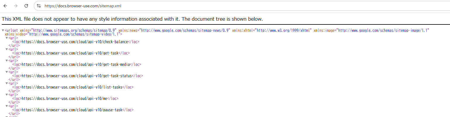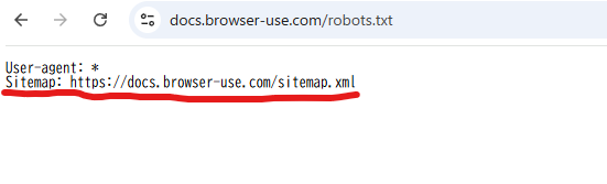 注意:もしsitemap.xmlが見つからない場合は、サイトマップが別の場所に格納してある可能性があるので、「/robots.txt」というファイルにアクセスしてサイトマップがどこにあるか探してください。 例:https://docs.browser-use.com/robots.txt