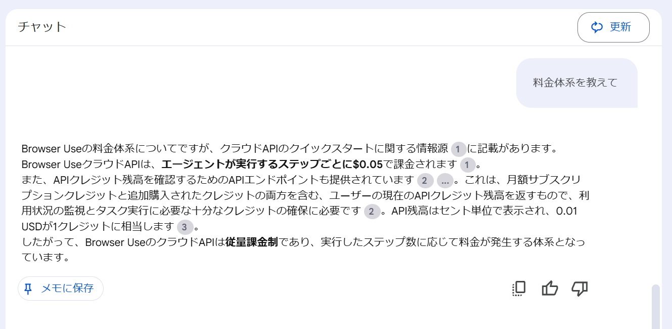 例えば「料金体系をおしえて」と聞いたら、ちゃんと回答してくれました!参照したページの情報も提供してくれるので、ソースチェックもはかどりますね。