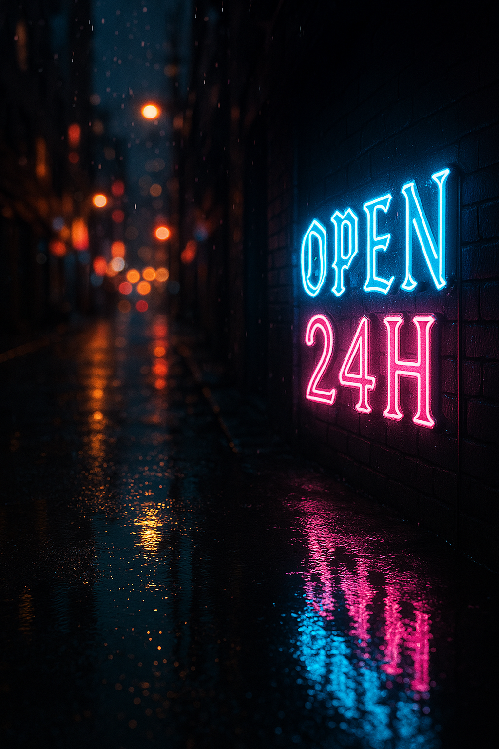 夜の賑やかな都市の路地裏。雨上がりの濡れたアスファルトに、鮮やかなネオンサインが反射している。ネオンサインの文字は『OPEN 24H』で、ゴシック体で表現。背景には、ぼやけた都市の光と、雨の雫が光る様子を描写。ネオンサインは、青とピンクの光で、レトロな雰囲気を出す。出力画像: