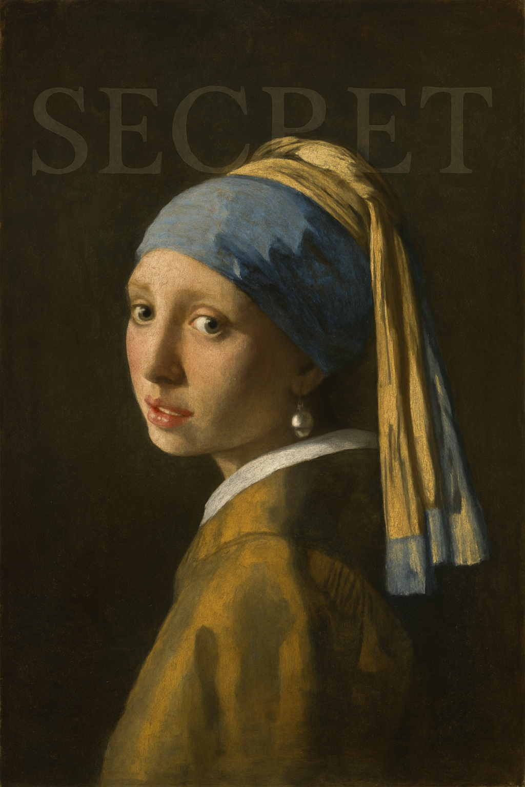 有名な絵画『真珠の耳飾りの少女』の中に、『SECRET』という文字を隠し文字のように組み込んでください。文字は、絵画の背景色に溶け込むように、淡いグレーで表現。文字のフォントは、絵画の雰囲気を壊さない、クラシックなセリフ体を使用。出力画像: