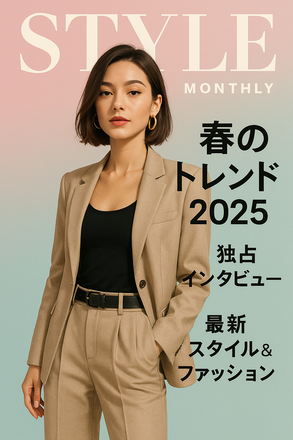 パステルカラーの背景に、スタイリッシュな女性が写っているファッション雑誌の表紙風デザイン。上部に大きく『STYLE MONTHLY』というタイトル。『春のトレンド2025』『独占インタビュー』などのサブタイトルも追加。モダンで編集されたようなレイアウト。出力画像: