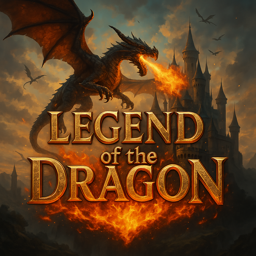 ファンタジーRPGのタイトル画面。『LEGEND of the DRAGON』というタイトル文字を、金属製の重厚なゴシック体で表現。背景には、ドラゴンが飛び交う、幻想的な城の風景を描写。タイトル文字は、金色に輝き、炎のエフェクトを付加。全体的に、壮大で迫力のある、ゲームの世界観を表現する。出力画像: