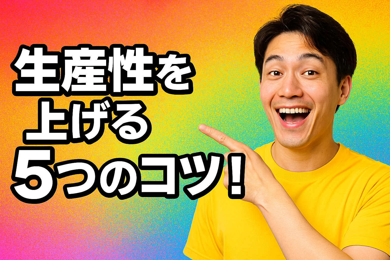 明るく目を引くYouTubeサムネイルデザイン。『生産性を上げる5つのコツ!』という大きな文字(白に黒の縁取り)。文字を指差して笑っている人物。カラフルなグラデーション背景で、ポップでエネルギッシュな雰囲気。出力画像: