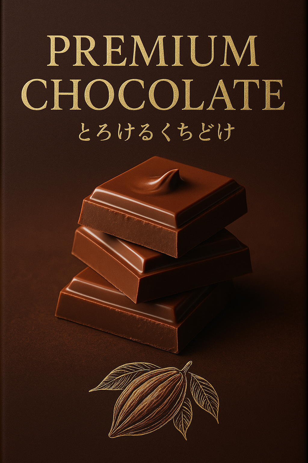 新発売のチョコレートのパッケージデザイン。『PREMIUM CHOCOLATE』という文字を、高級感のあるセリフ体で表現。サブタイトルとして「とろけるくちどけ」という文言も含める。チョコレートのイメージ写真と、カカオ豆のイラストを、パッケージに配置。文字の色は、深みのある茶色と金色を使用し、高級感を演出する。出力画像: