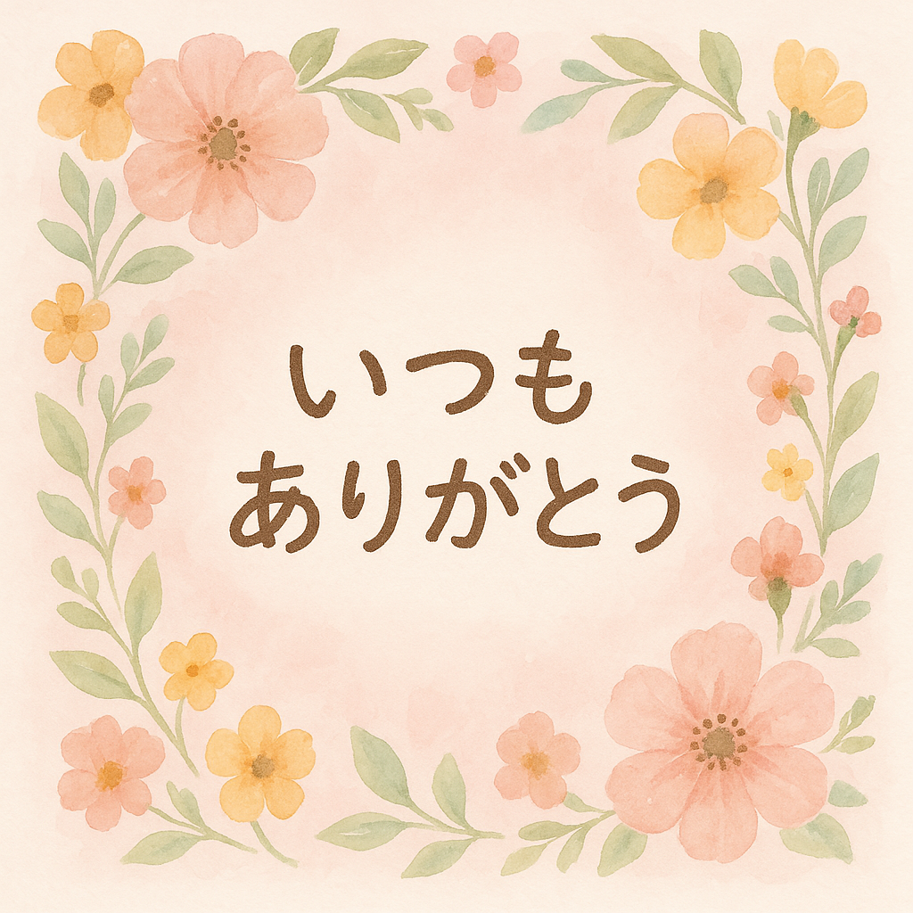 大切な人へのメッセージカード。『いつもありがとう』というメッセージを、温かみのある手書き風のフォントで表現。メッセージの周りには、水彩画のような、優しい色合いの花のイラストを配置。背景は、淡いピンク色のグラデーションで、柔らかな雰囲気を出す。出力画像: