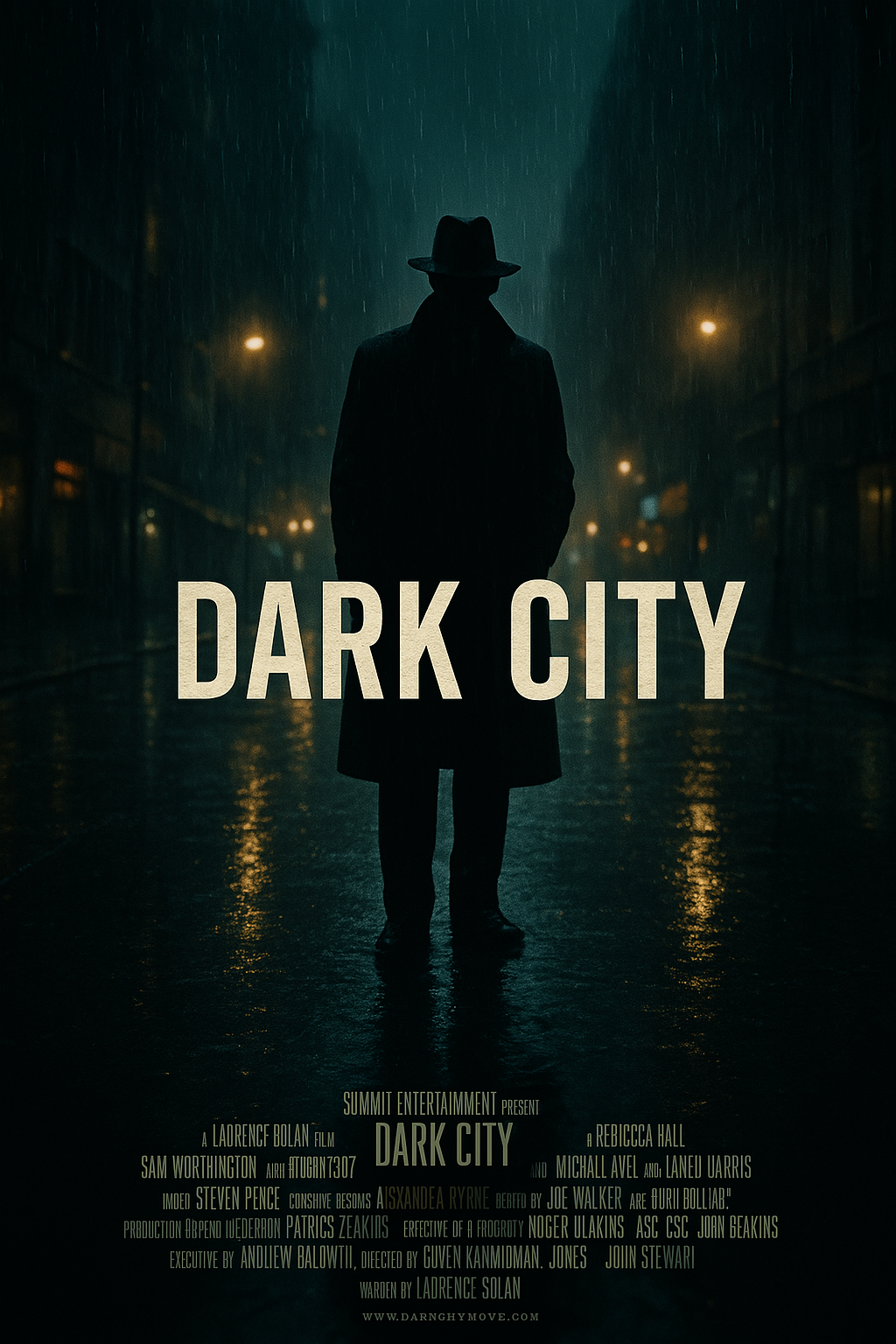 映画『暗闇の街』のポスター。中央に大文字でタイトル。雨に濡れた夜の通りに立つ謎めいた人物。路面に光が反射している。暗めのトーンでシネマティックな構図。下部に小さな文字でクレジット表示も。出力画像: