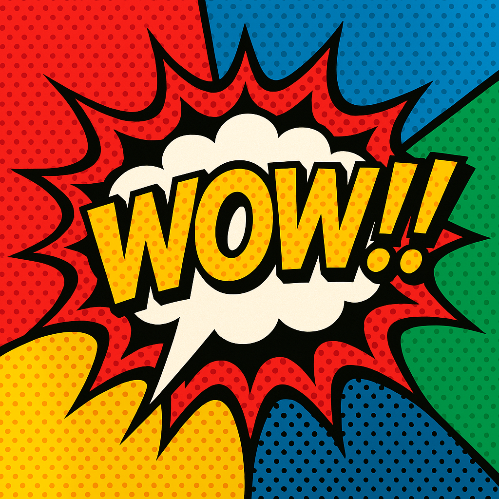 ビビッドな色合いとハーフトーンパターンを使ったポップアートスタイルのイラスト。吹き出しの中に『WOW!』という大きな文字。太い黒い輪郭、原色系の明るい色、1960年代のアメコミ風デザイン。出力画像: